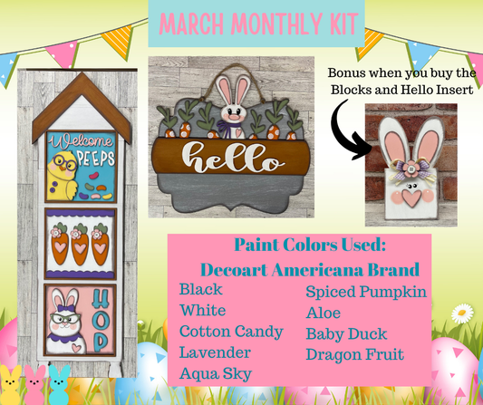 Both March 2025 Insert and blocks only - March Craft Kit - Hello Door Sign Insert and House Ladder Blocks Only unpainted cutouts, Bonus Bunny Kit - doesn't include the door sign backer and house leaning ladder