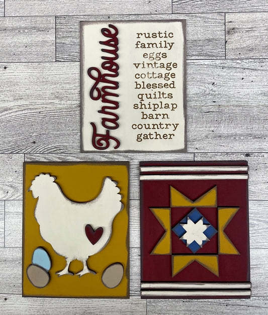 Farmhouse Decor trio of signs with easels - unpainted wooden cutouts, ready for you to paint