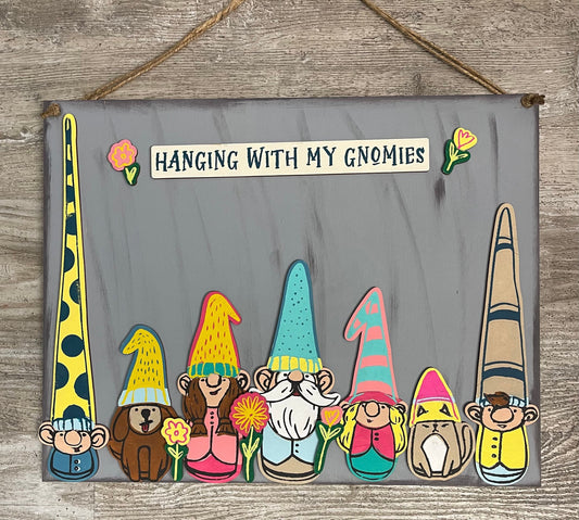 Hanging with my Gnomies Cutouts with scoring, Kit does not include sign backer, ready to paint, unpainted wood cutouts