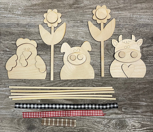 Farm animal and Sunflower plant stick cutouts, set of 5 with dowels and ribbon, unpainted wooden cutout - ready for you to paint