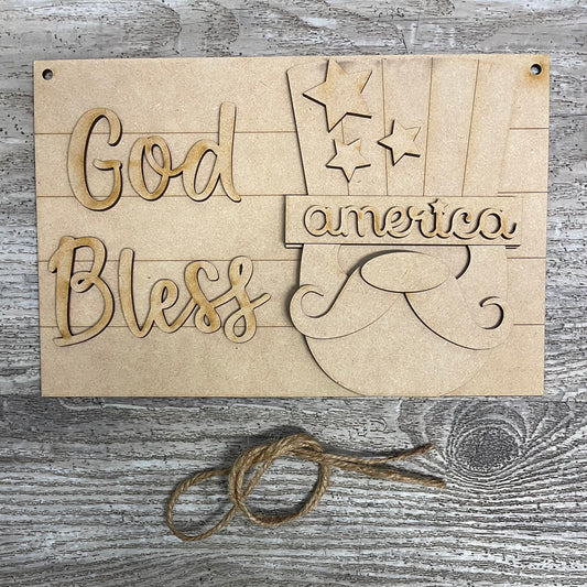 God Bless America Uncle Sam Sign, Patriotic unpainted wooden cutout - ready for you to paint