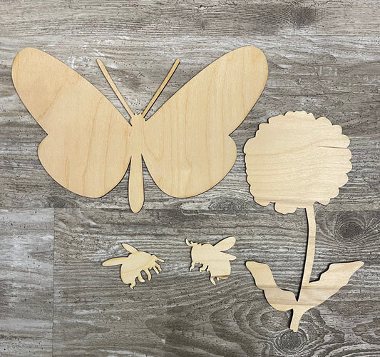 1 Flower, 1 Butterfly and 2 Bee cutouts ready for you to paint - back sign is not included