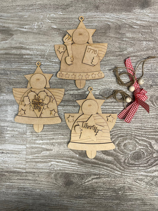 3 Patriotic Angel Ornaments, 8 inches tall, wood cutouts, unpainted ready for you to finish