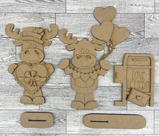 Valentines Moose set of 2 with Mail Box wood cutouts, unpainted ready for you to paint