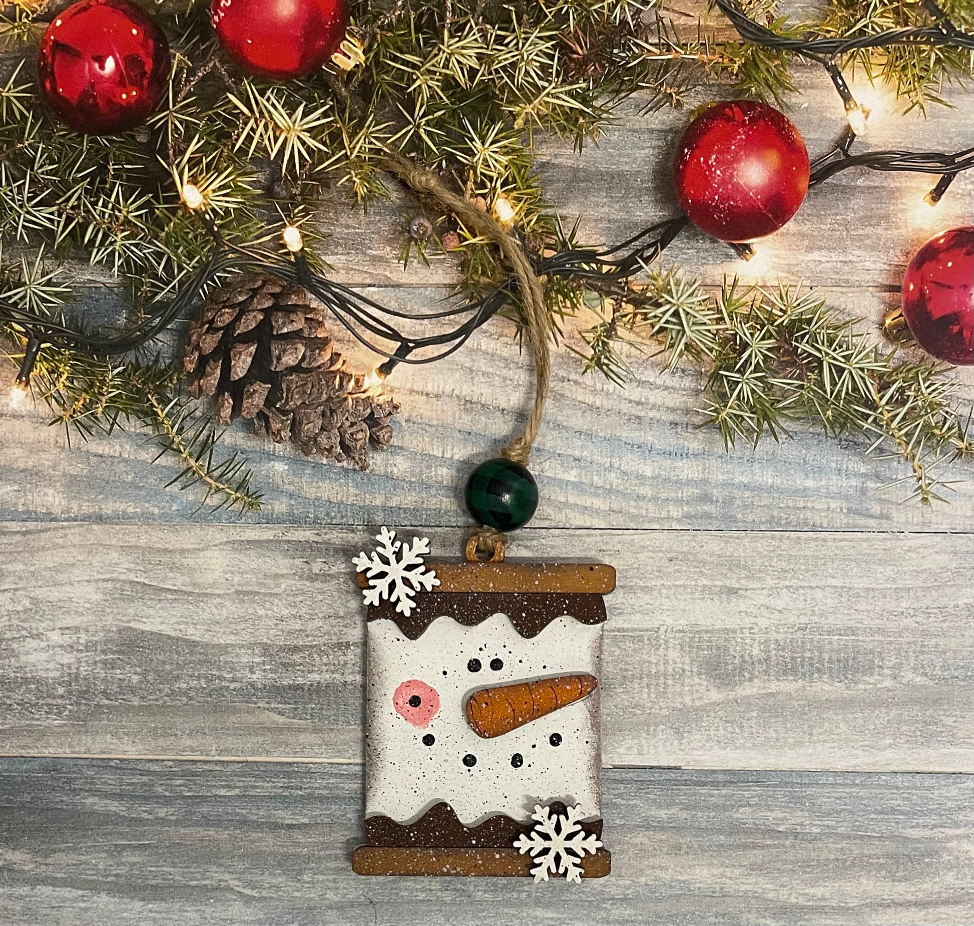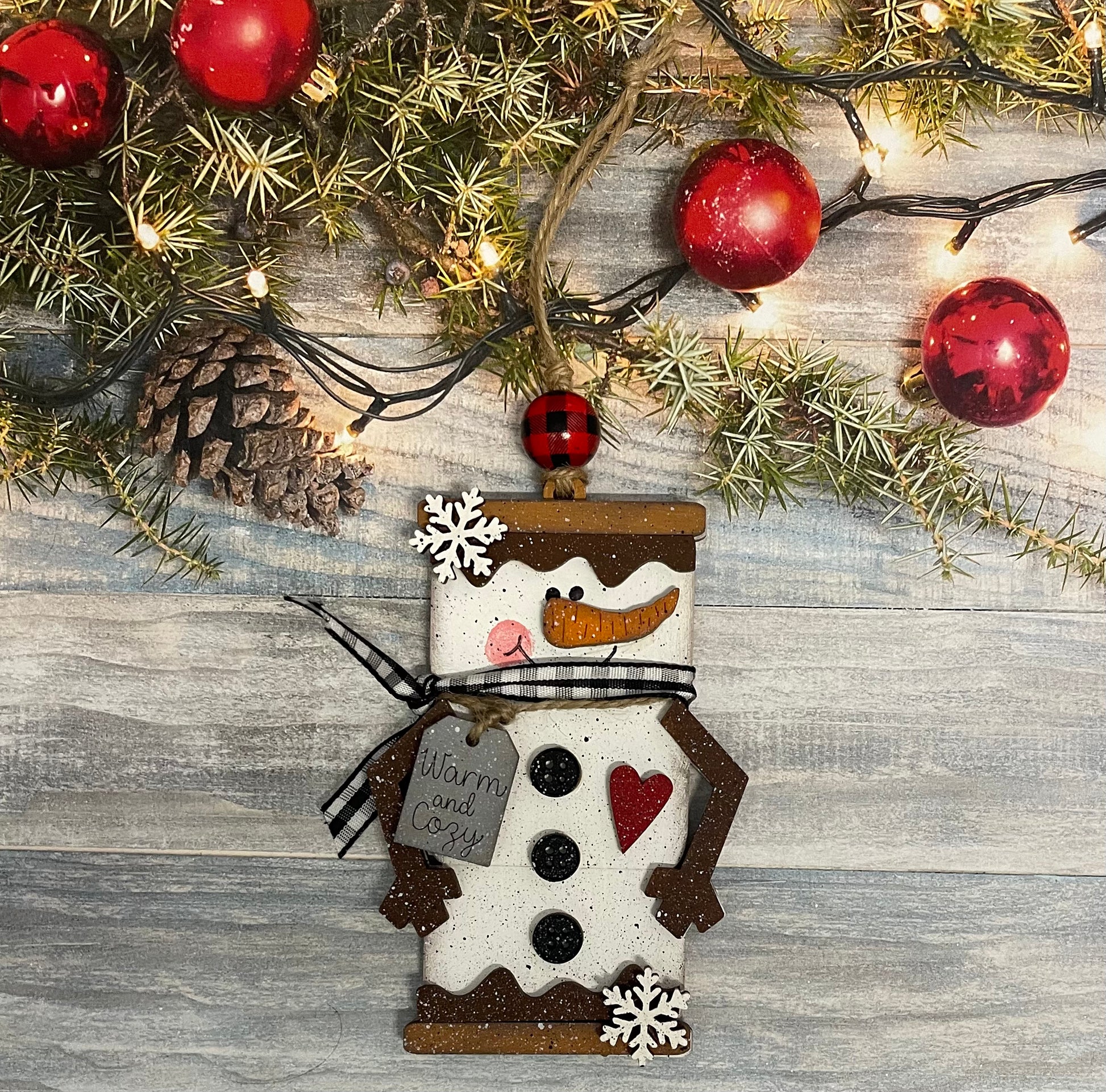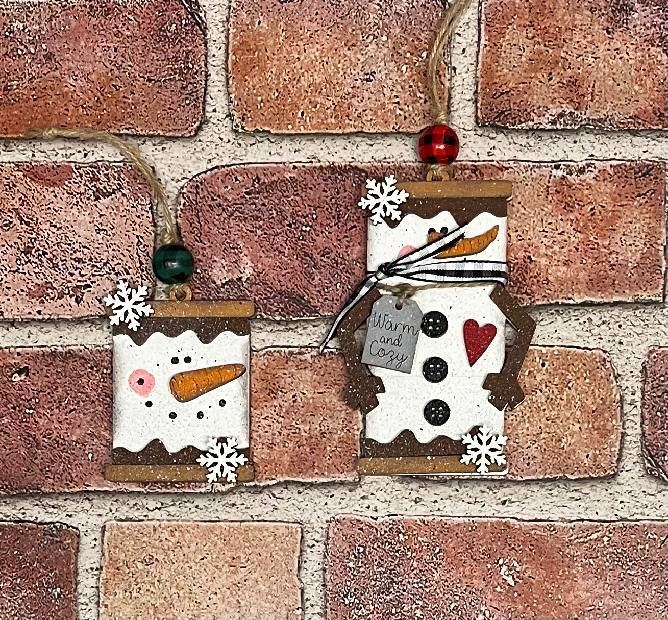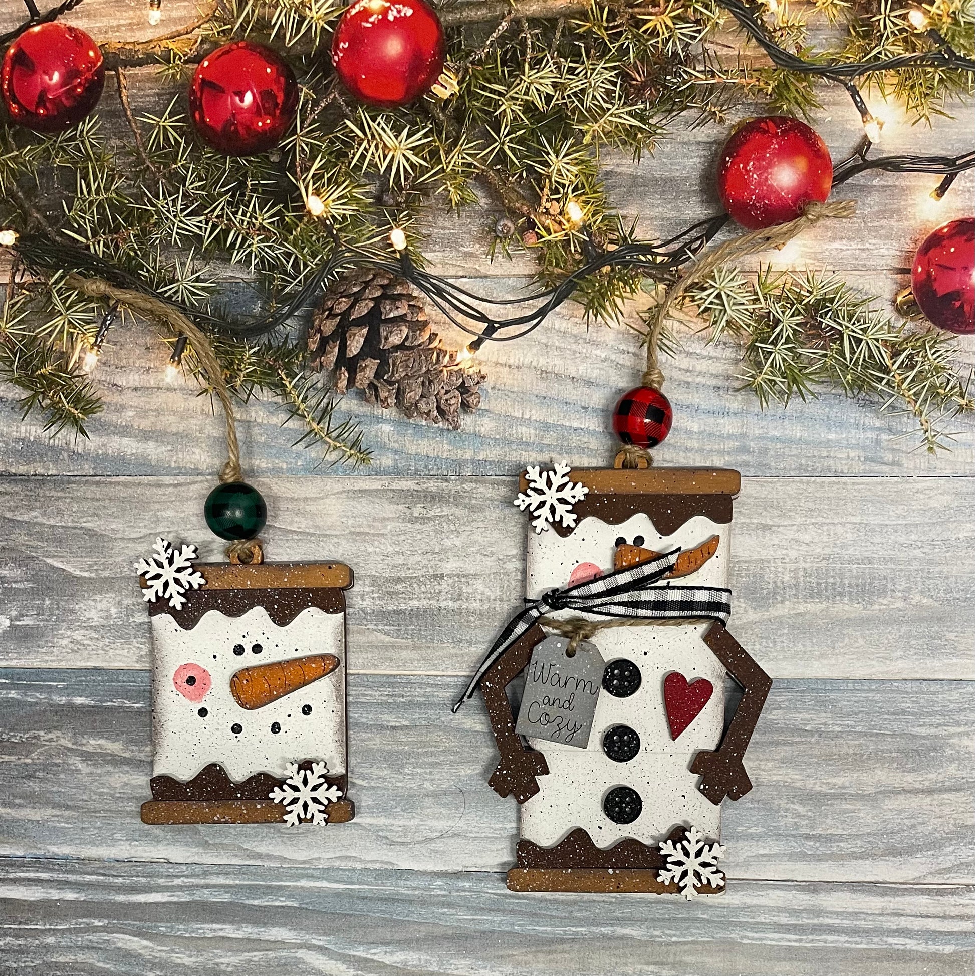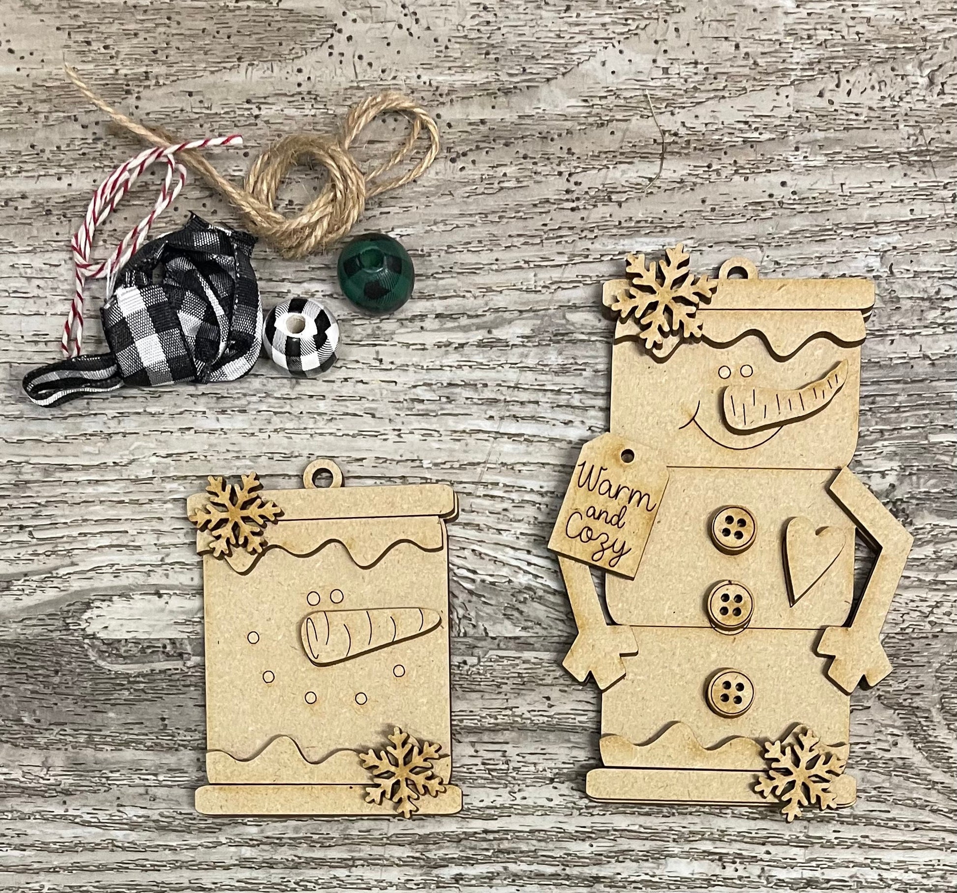2 Snowman Smore ornaments, unpainted wooden cutouts ready for you to paint with jute and beads