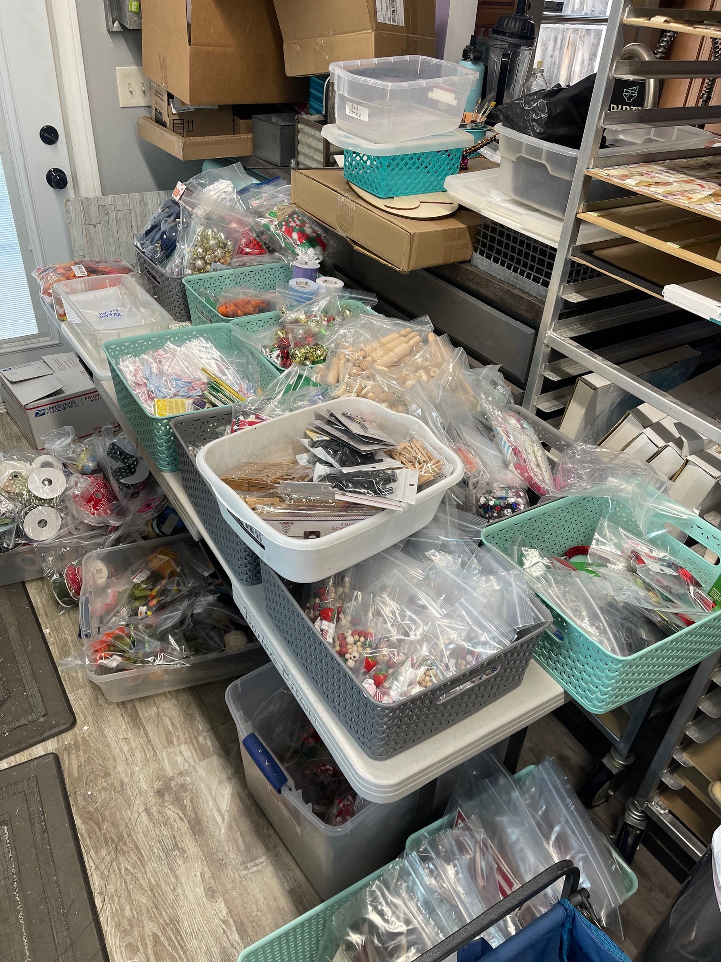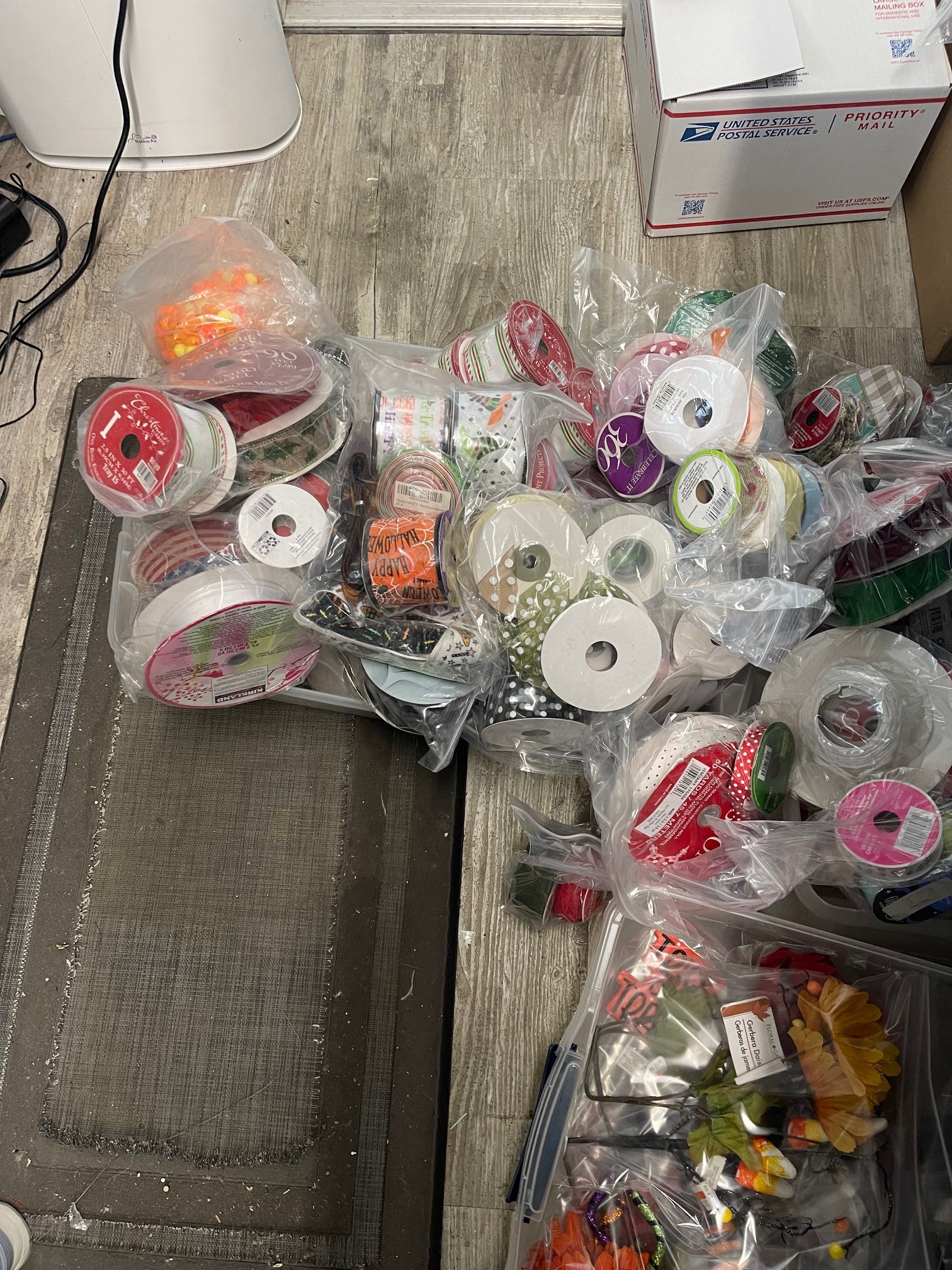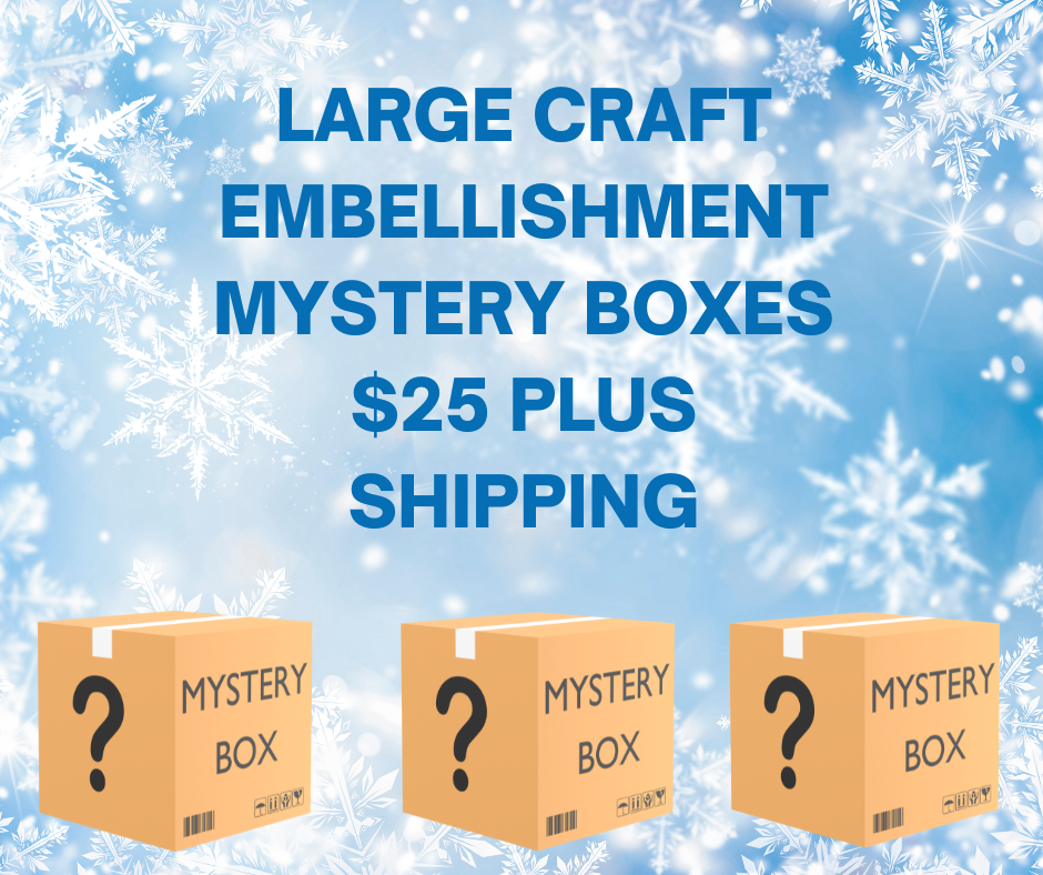This mystery box is LARGE 12" x 12" x 8" and contains items such as ribbon, wire, glitter, rhinestones, Christmas embellishments, pompoms, buttons, beads, etc.