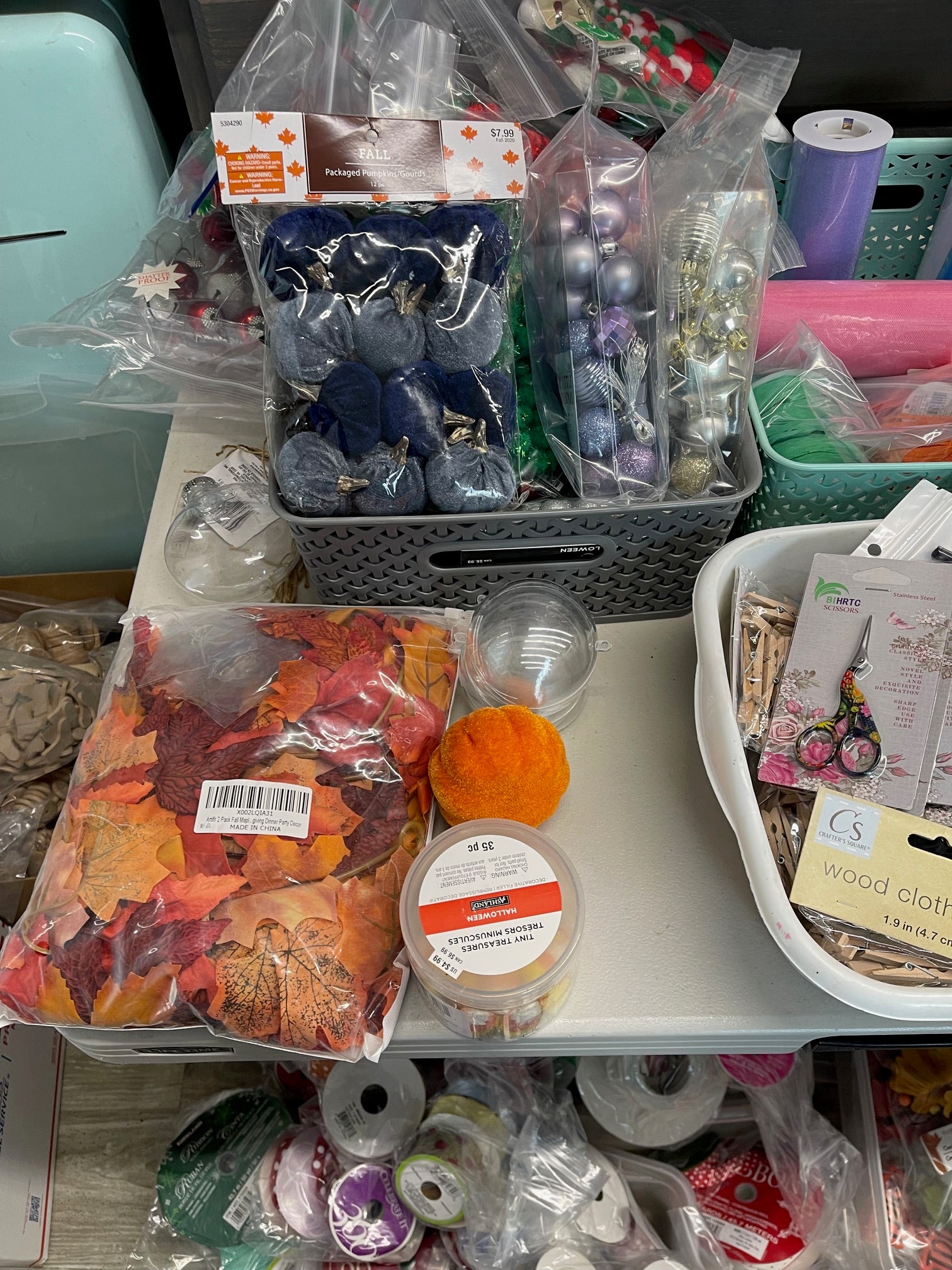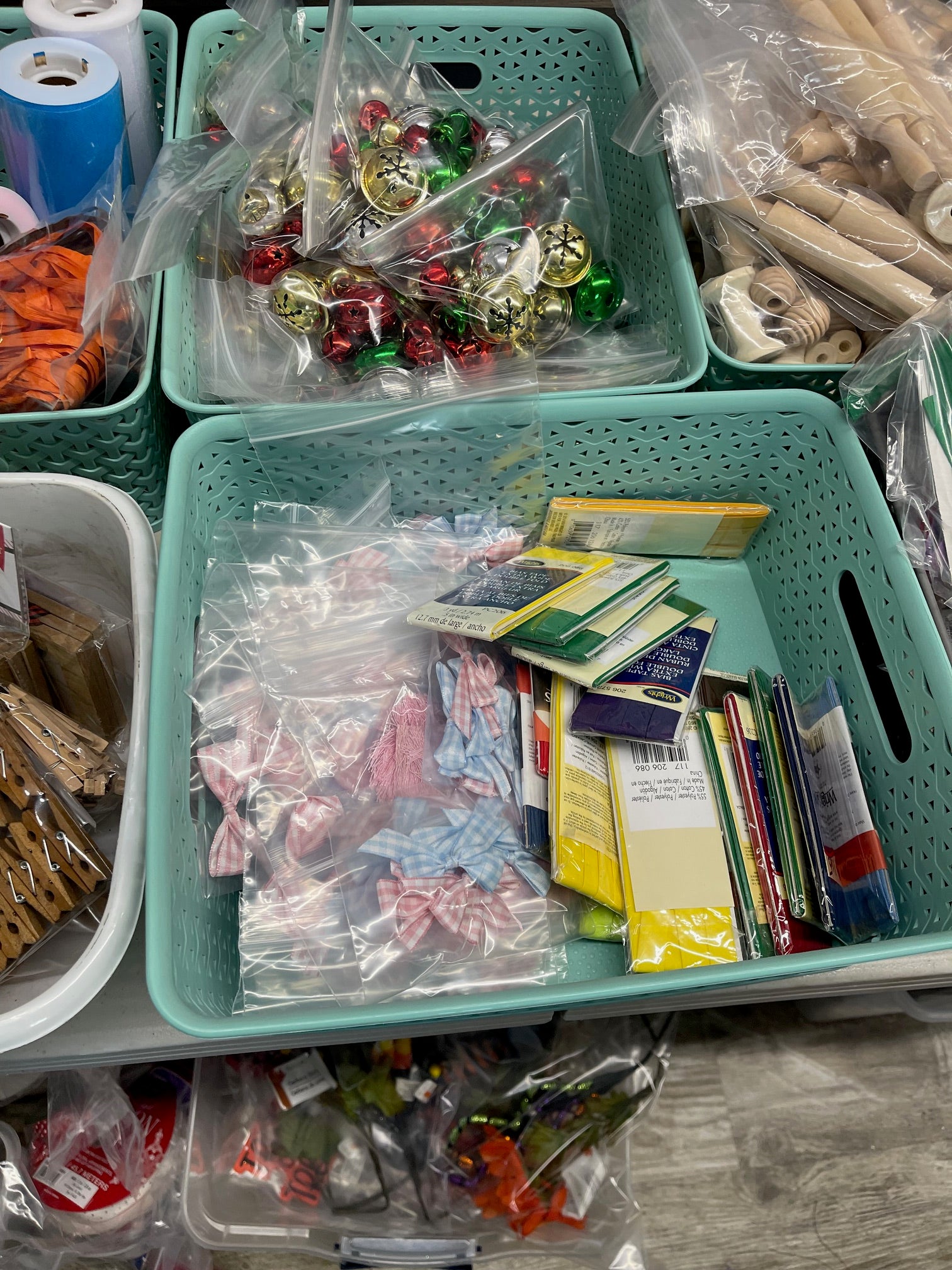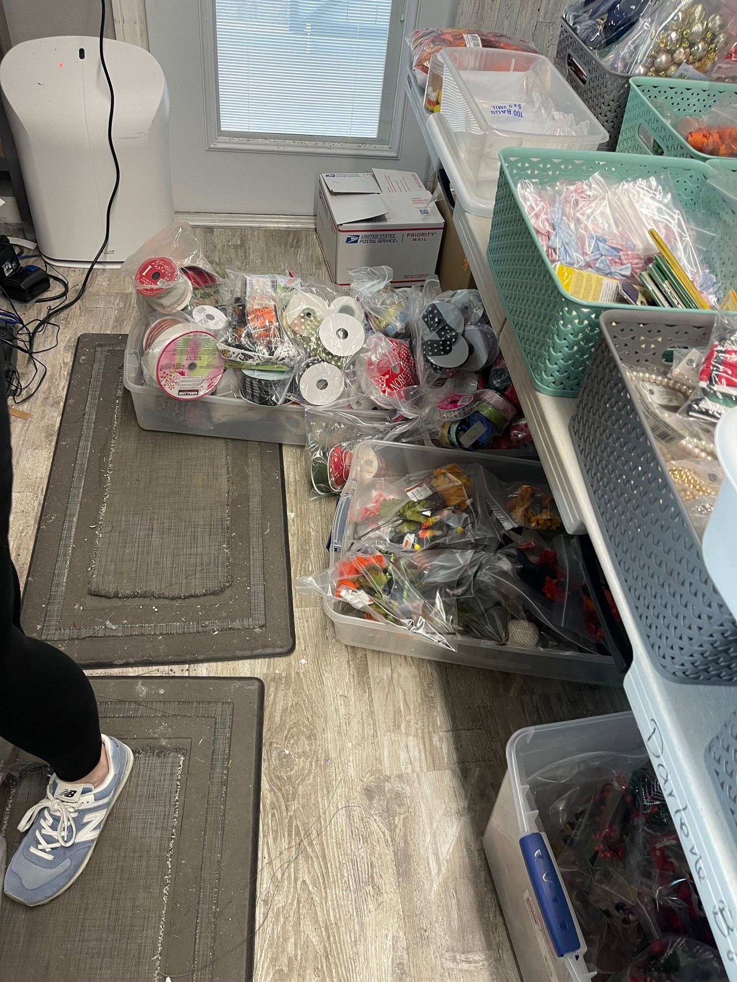 This mystery box is LARGE 12" x 12" x 8" and contains items such as ribbon, wire, glitter, rhinestones, Christmas embellishments, pompoms, buttons, beads, etc.
