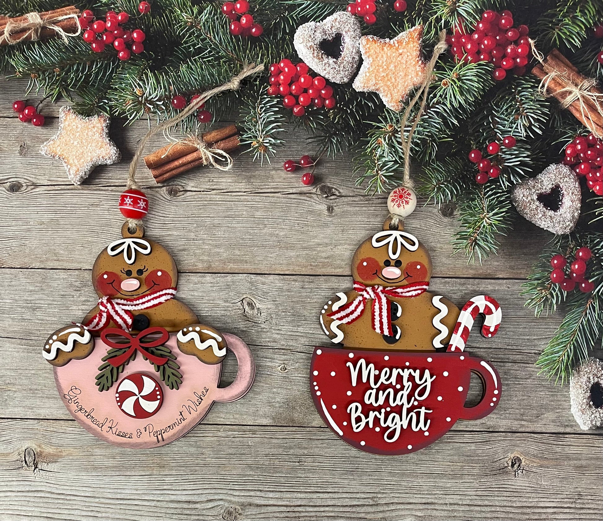 Gingerbread Hot Cocoa Ornaments - Set of 2 wooden ornament cutouts and ribbon, unpainted ready for you to finish