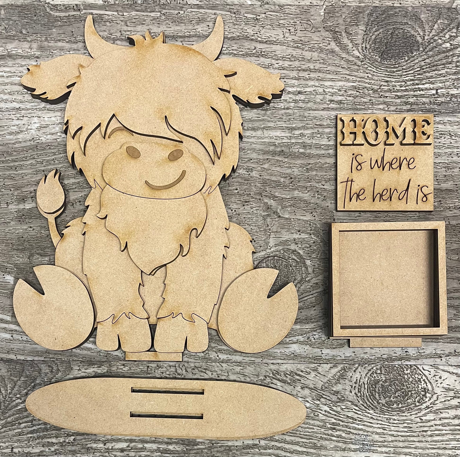 Highland Cow sitter with changeable sign wooden cutouts ready for you to paint