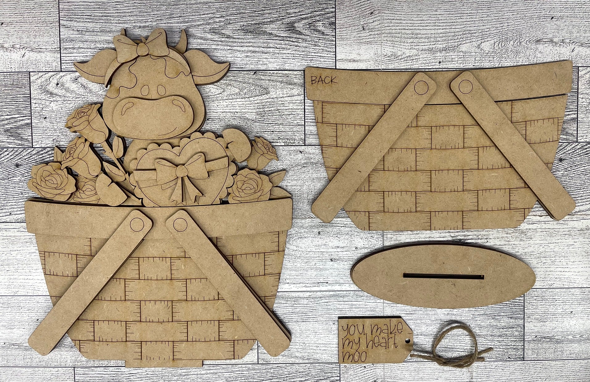 Valentine Dairy Cow Basket Insert Add-On - unpainted wood cutouts, ready for you to paint