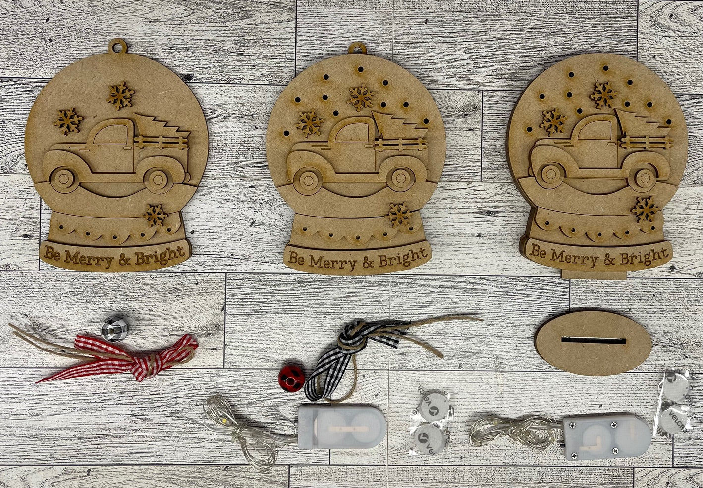 Red Truck - lighted Christmas Globe Ornament or Stander - unpainted wood cutouts, ready for you to paint - ribbon and beads will vary