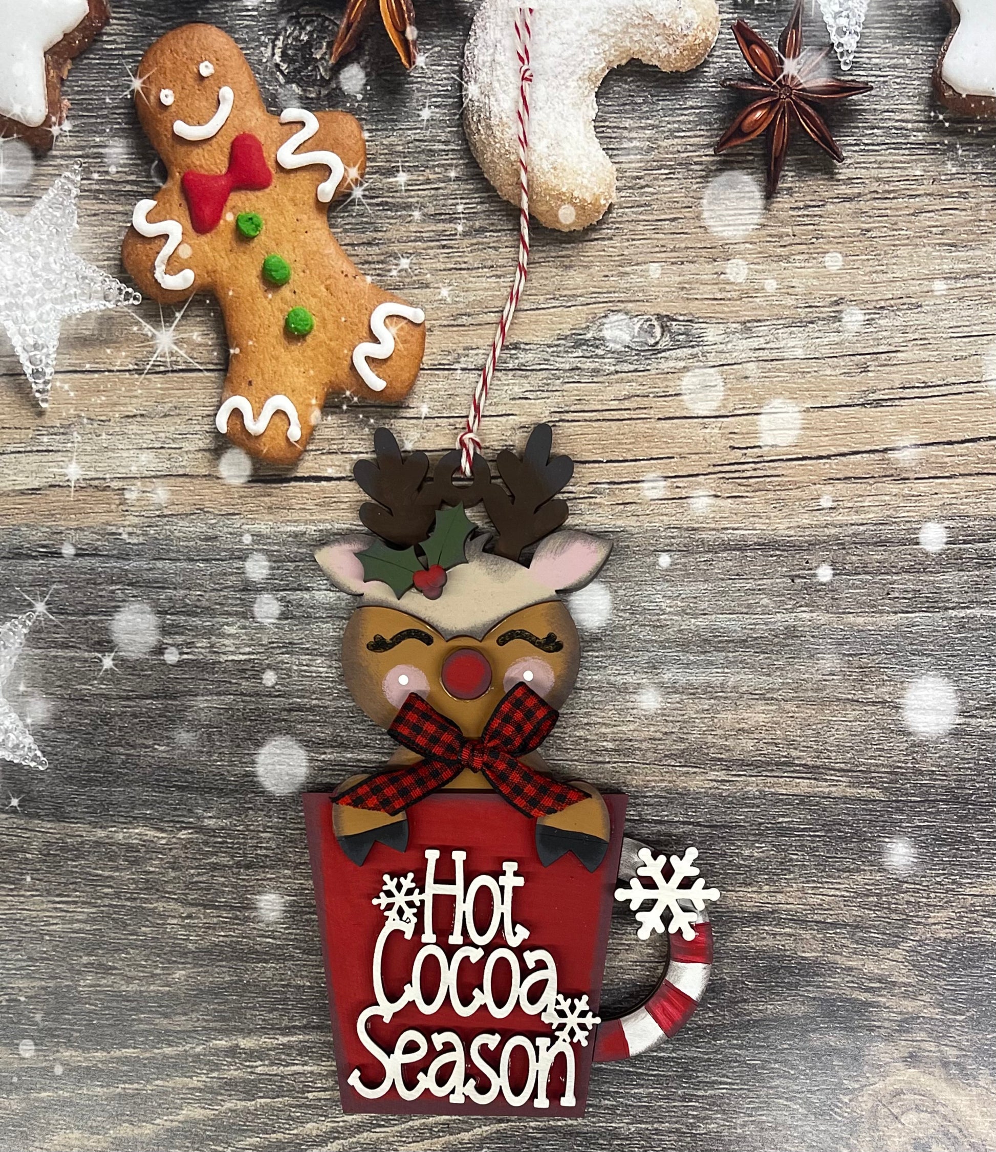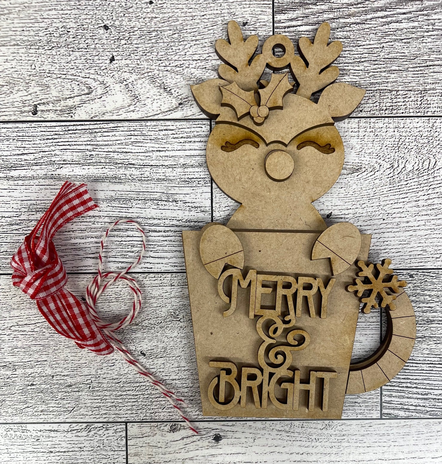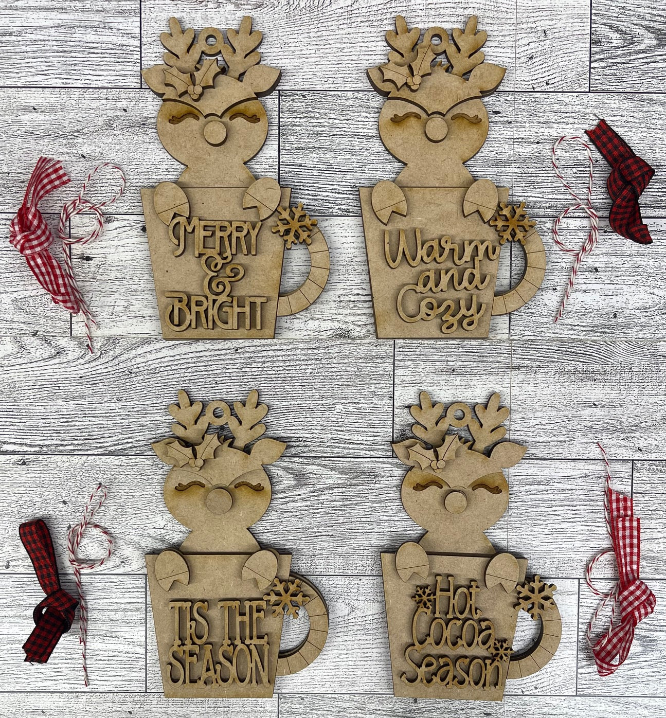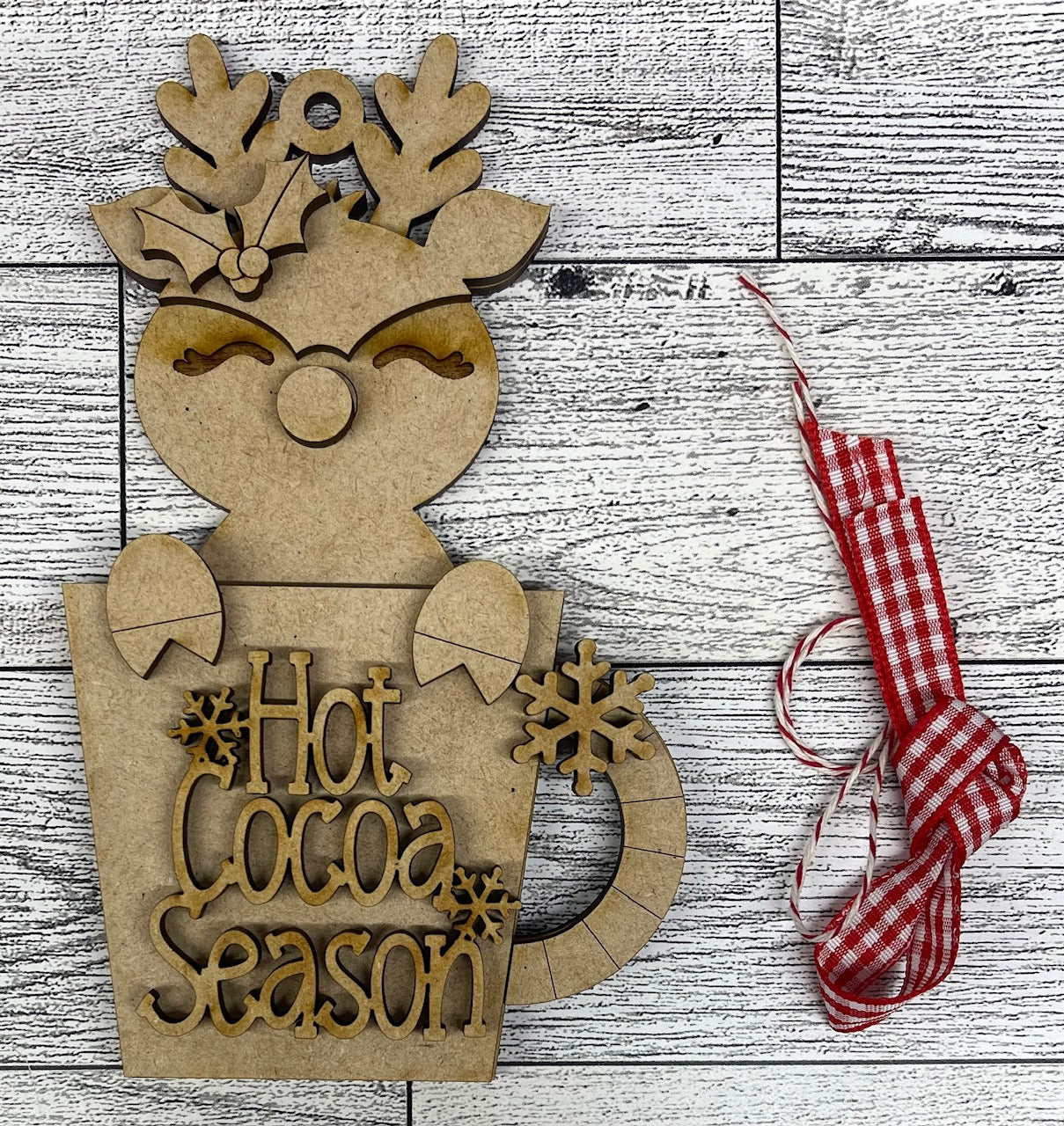 Reindeer Hot Cocoa Christmas Ornaments unpainted cutouts ready for you to finish painting