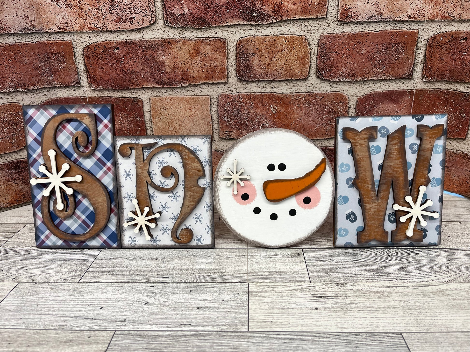 Snow word kit - wood pieces, unpainted wood cutouts, ready for you to paint. The scrapbook paper is not included.