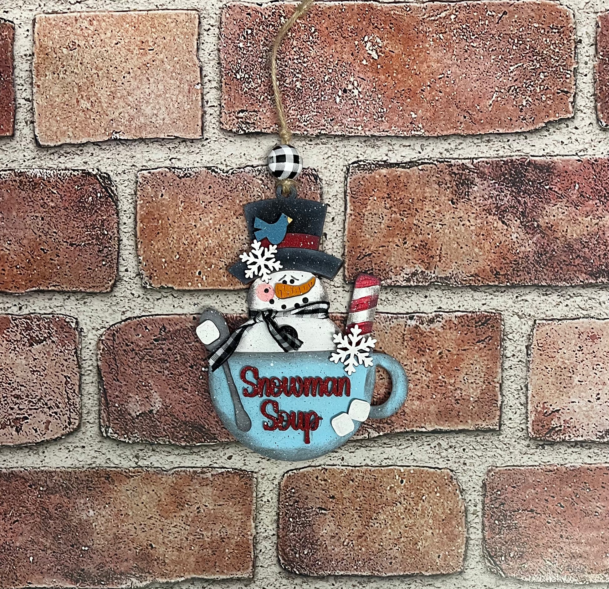 Snowmen Soup Ornament, Unpainted Christmas Ornament, unpainted ready for you to finish, with jute and beads