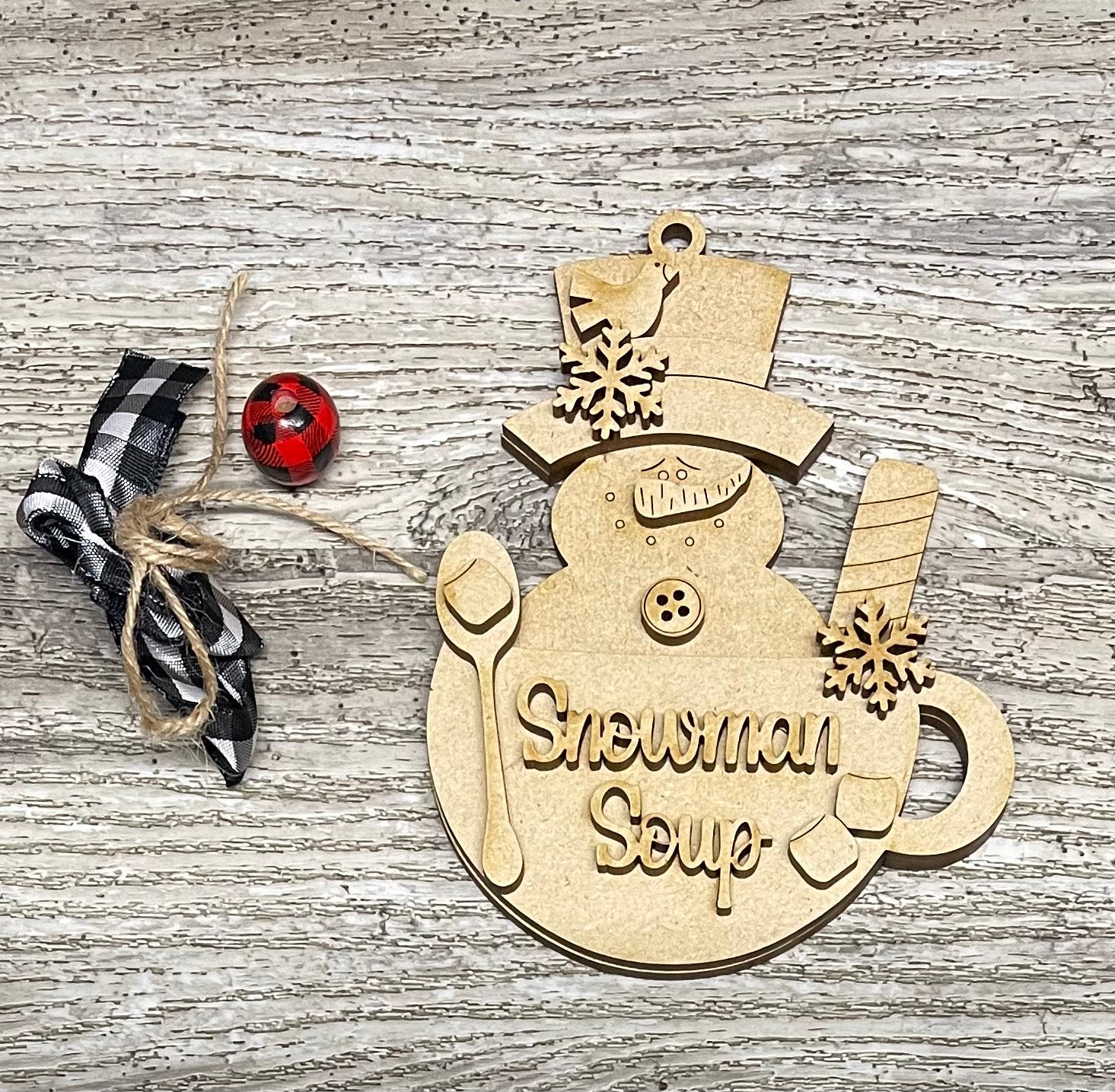Snowman Soup ornament, unpainted wooden cutouts ready for you to paint with jute and beads