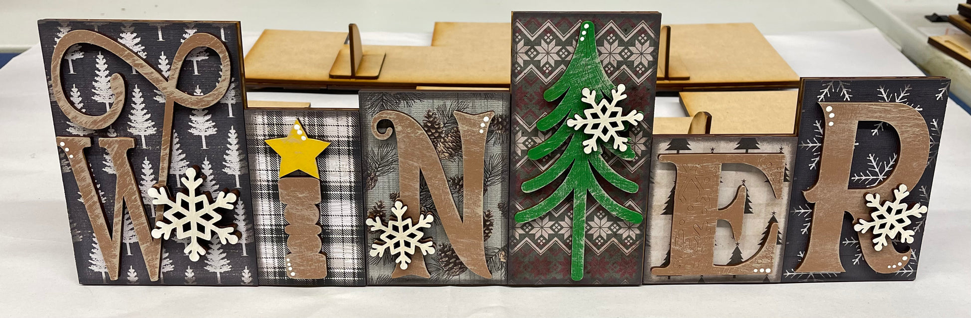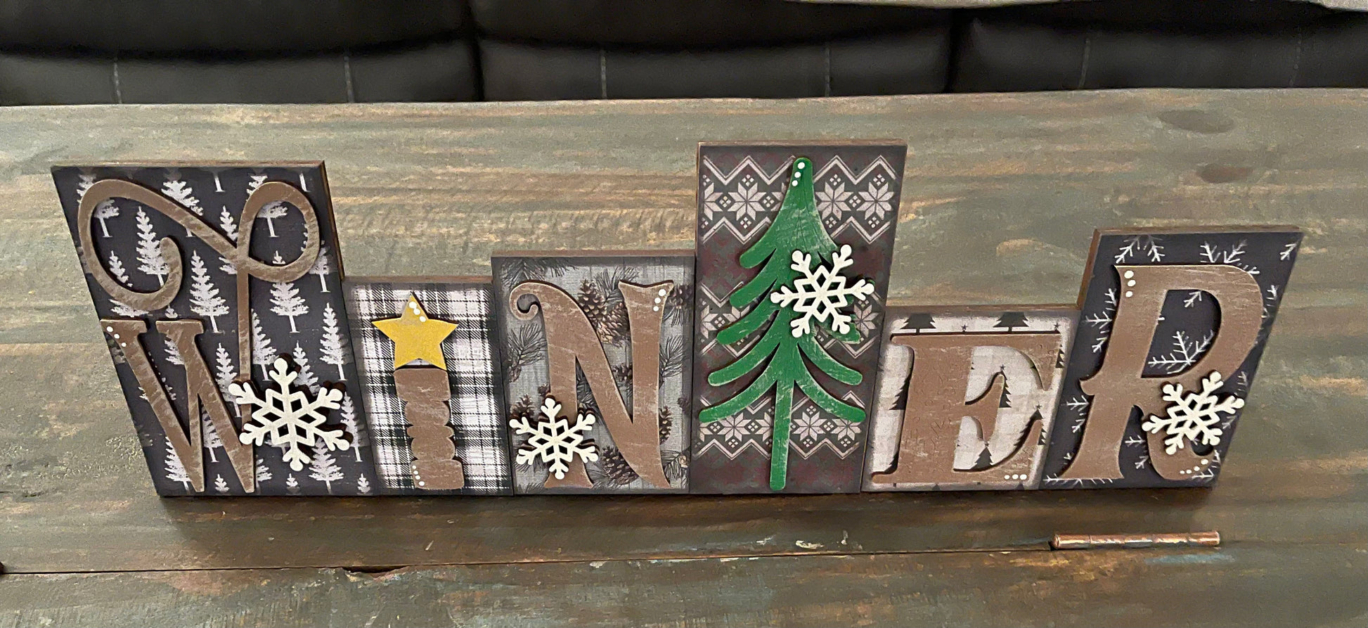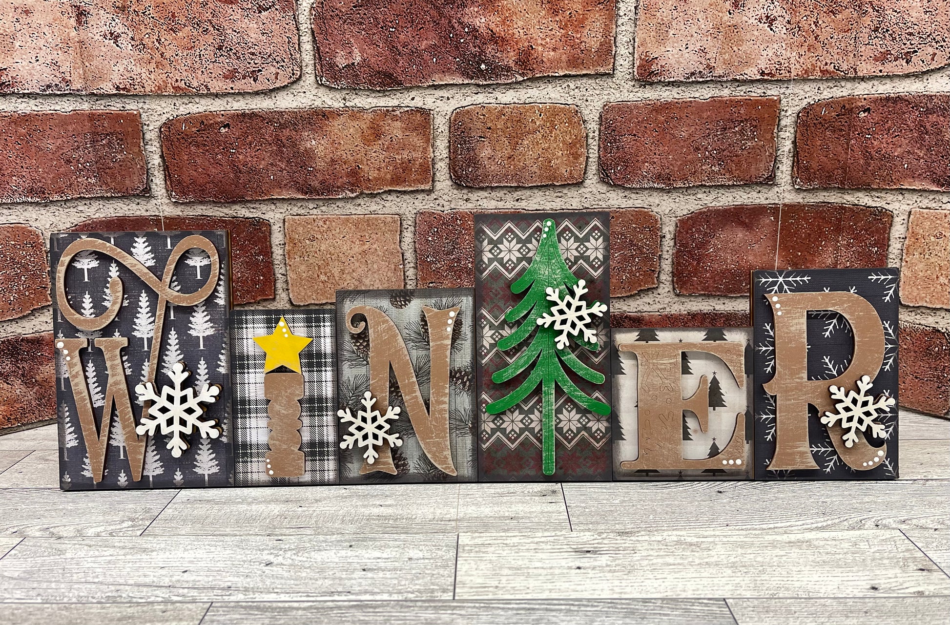 Winter word kit - wood pieces, unpainted wood cutouts, ready for you to paint. The scrapbook paper is not included.